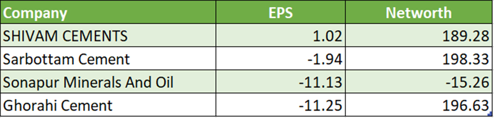 अन्य कम्पनीहरुको प्रतिशेयर आम्दानी भने ऋणात्मक अवस्थामा रहेको छ । प्रतिशेयर नेटवर्थमा भने घोराही सिमेन्ट अग्र छ । कम्पनीको प्रतिशेयर नेटवर्थ १९६.६३ रुपैयाँ रहेको छ ।