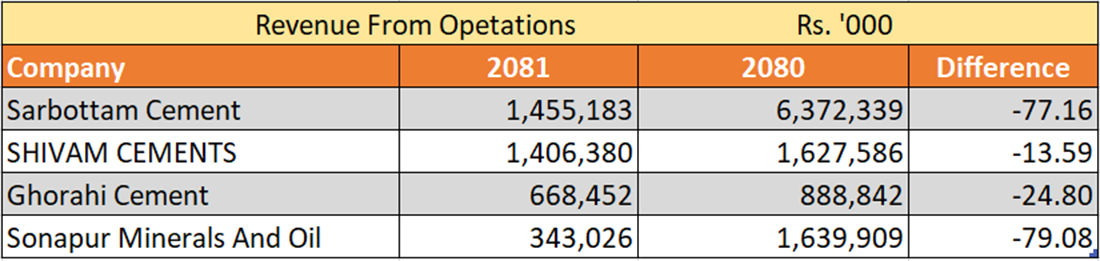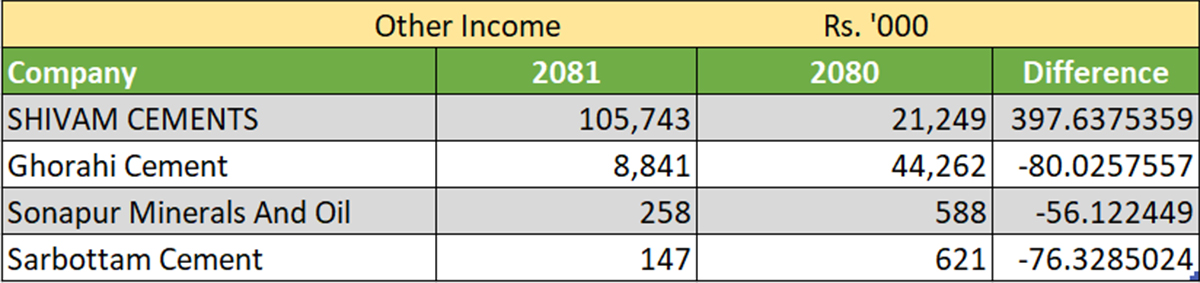 त्यस्तै, घोराही सिमेन्टको ८० प्रतिशतले घटेर ८८ लाख रुपैयाँ, सोनापुरको ५६ प्रतिशतले घटेर २ लाख रुपैयाँ र सर्वाेत्तमको ७६ प्रतिशतले घटेर १ लाख रुपैयाँमा अन्य आम्दानी सीमित बनेको छ ।