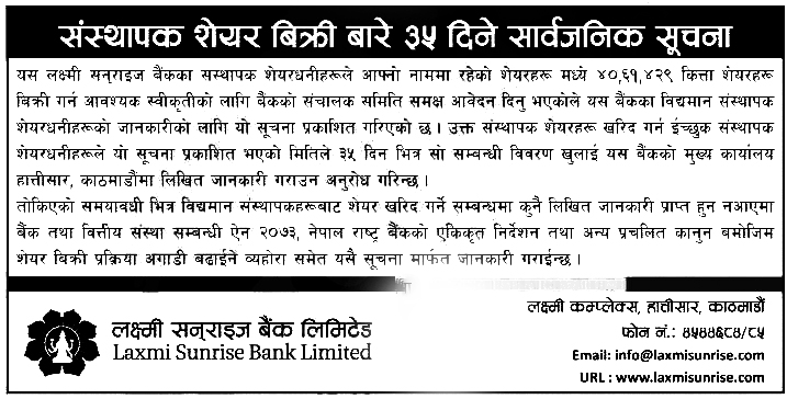 काठमाडौं । लक्ष्मी सनराइज बैंक लिमिटेडले संस्थापक शेयर बिक्रीमा राखेको छ। बैंकले केही संस्थापक शेयरधनीहरूको स्वामित्वमा रहेको ४० लाख ६१ हजार ४२९ कित्ता शेयर बिक्रीमा राखेको हो।