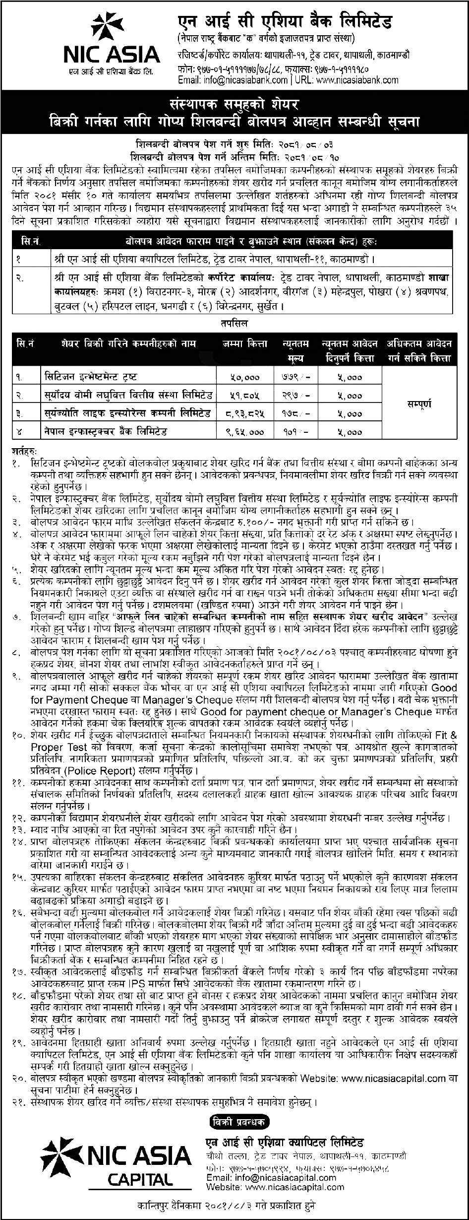 एकैपटक ४ कम्पनीको शेयर बेच्दै एनआईसी एशिया बैंक, मूल्य कति?