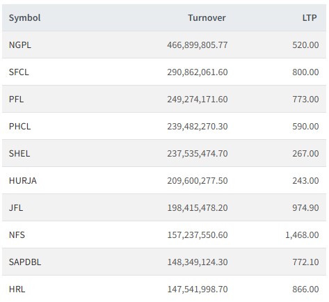 त्यस्तै, समिद्ध फाइनान्स, पोखरा फाइनान्स, सिंगटी हाईड्रोपावर, पिपुल्स पावर, हिमालयन उर्जा, सप्तकोशी हाईड्रोपावर, जानकी फाइनान्स, नेपाल फाइनान्स, हिमालयन रिको सर्वाधिक कारोबार भएको छ।