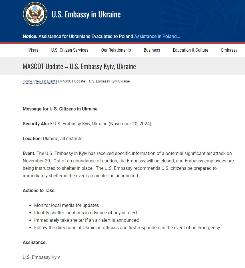 युक्रेनका लागि अमेरिकी राजदुताबासले आफ्नो वेभसाइटमा आजै नोभेम्वर २० तारिखमा भिषण हवाई हमला गर्ने गोप्य सूचना प्राप्त भएकोले दुताबासको कार्यालय बन्द हुने र सबै कर्मचारी तथा अमेरिकी नागरिकहरुलाई बम सेल्टरमा लुक्न सूचित गरिएको छ ।