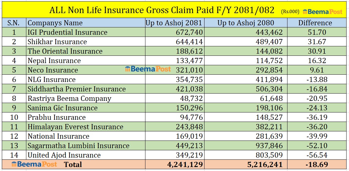 यस अवधिमा सिद्धार्थ प्रिमियर इन्स्योरेन्सले ४२ करोड १० लाख रुपैयाँ, एनएलजी इन्स्योरेन्सले ३५ करोड ४७ लाख रुपैयाँ, युनाइटेड अजोड इन्स्योरेन्सले ३४ करोड रुपैयाँ, नेको इन्स्योरेन्सले ३२ करोड १० लाख रुपैयाँ, हिमालयन एभरेष्ट इन्स्योरेन्सले २४ करोड ३८ लाख रुपैयाँ बराबरको कुल बीमा दावी भुक्तानी गरेकोे छ ।