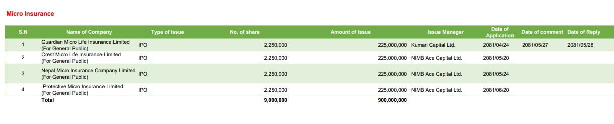 आइपीओ निष्कासनको माग गर्दै सेबोनमा आवेदन दिनेमा गार्डियन माइक्रो लाइफ, क्रेस्ट माइक्रो लाइफ, नेपाल माइक्रो र प्रोटेक्टिभ माइक्रो इन्स्योरेन्स कम्पनी रहेका छन् । यी चार कम्पनीहरुले अंकित मूल्य १०० रुपैयाँमा ९० लाख कित्ता बराबरको आइपीओ निष्कासन गर्ने लागेको हुन् ।