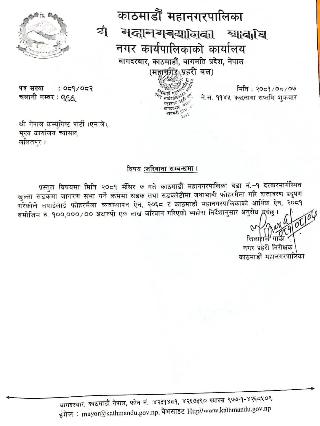 शुक्रबार दरबारमार्गमा जागरण सभाका क्रममा सडक तथा सडक पेटीमा जथाभावी फोहोर गरेको भन्दै महानगरपालिकाले एक लाख रुपैयाँ जरिवाना गरिएको व्यहोराको पत्र पठाएको छ ।
