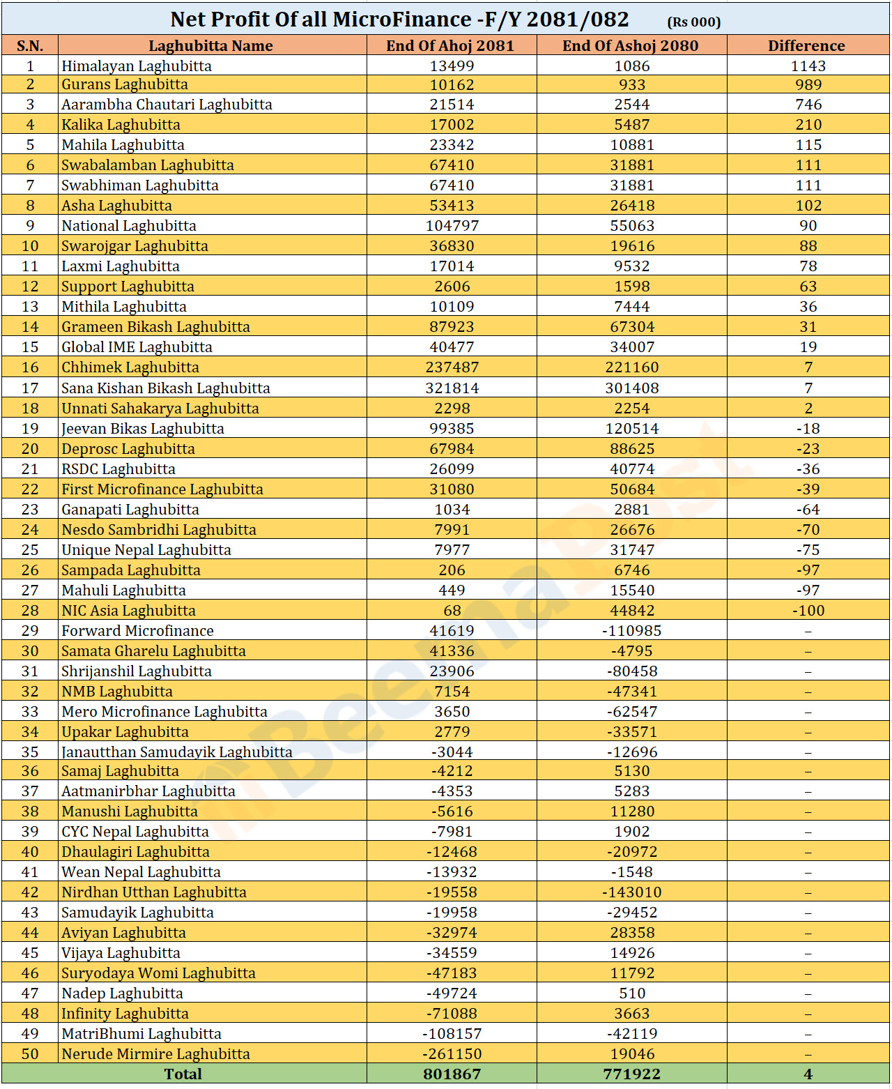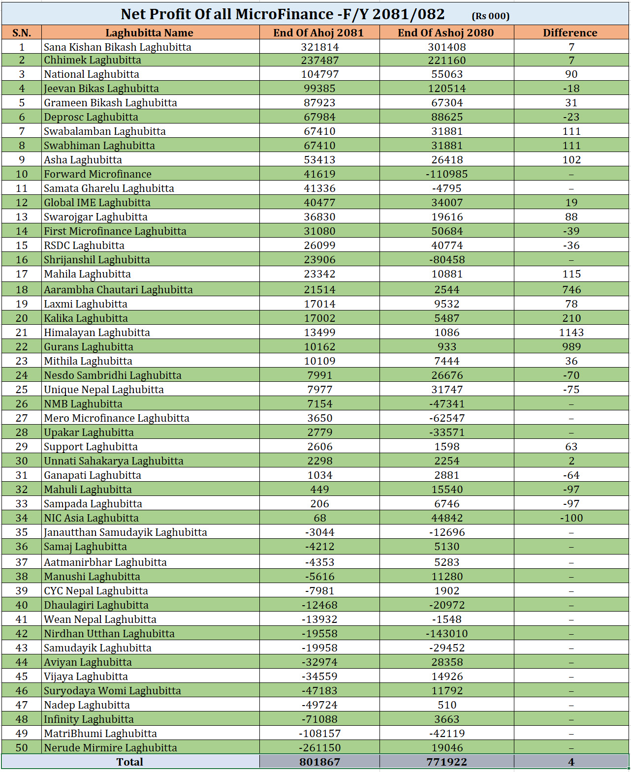 यस अवधिमा जनउत्थान सामुदायिक, समाज लघुवित्त, मानुषी, सीवाइसी नेपाल, धौलागीरी, विन नेपाल, निर्धन उत्थान, सामुदायिक, अभियान, विजय, नेरुडे मिर्मिरे लघुवित्त लगायतका संस्थाहरुको मुनाफा उच्च अंकले ऋणात्मक रहेका छन् ।