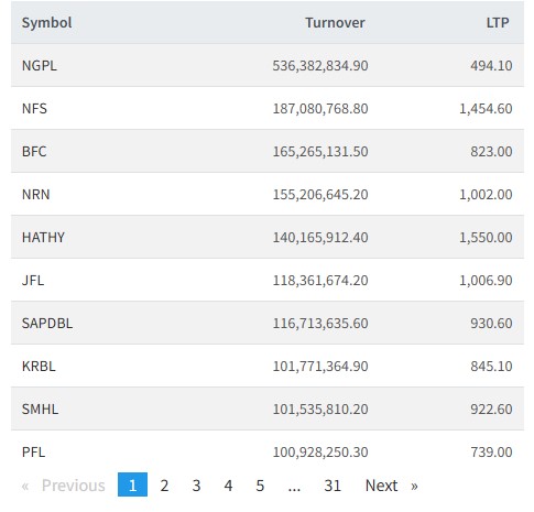 त्यस्तै, बेष्ट फाइनान्स, एनआरएन इन्फ्रास्टक्चर, हाथवे इन्भेष्टमेन्ट, जानकी फाइनान्स, सप्तकोशी विकास बैंक, सुपर मादी हाईड्रोपावर, कर्णाली डेभलपमेन्ट बैंक र पोखरा फाइनान्से सर्वाधिक कारोबार भएको छ।