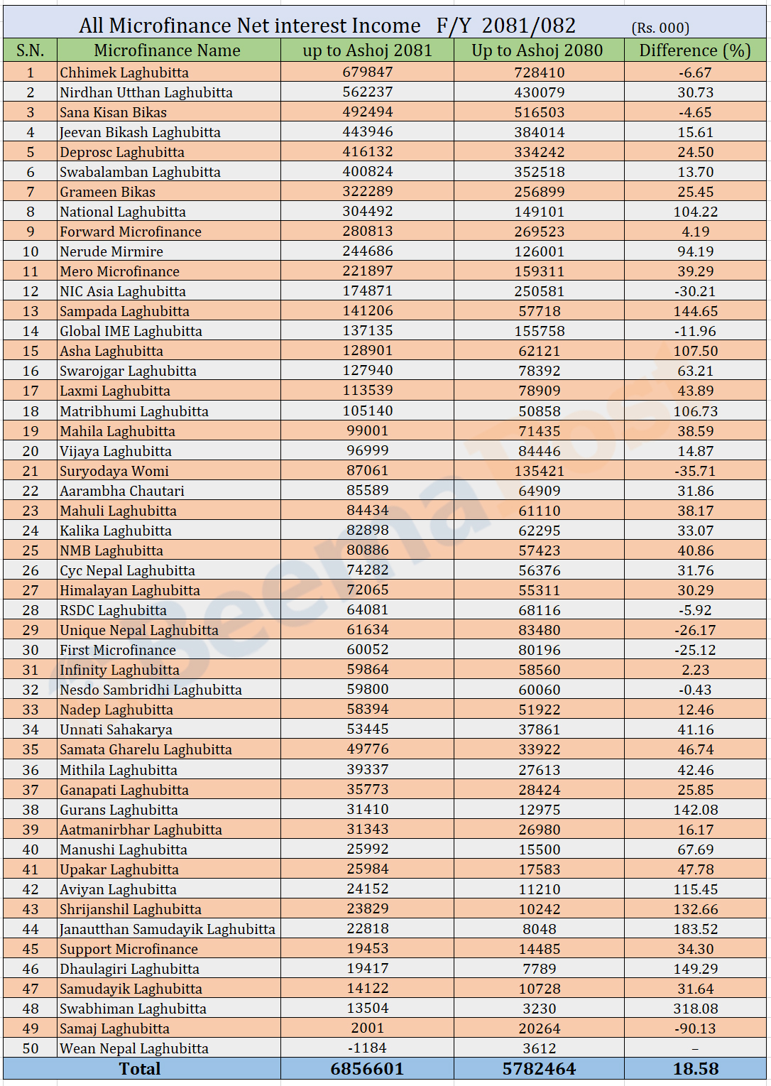 त्यस्तै, यस अवधिमा जीवन विकास लघुवित्तको ब्याज आम्दानी ४४ करोड ३९ लाख रुपैयाँ, डिप्रोक्स लघुवित्तको ४१ करोड ६१ लाख रुपैयाँ, स्वावलम्बन लघुवित्तको ४० करोड आठ लाख रुपैयाँ, ग्रामिण विकास लघुवित्तको ३२ करोड २२ लाख रुपैयाँ, नेशनल लघुवित्तको ३० करोड ४४ लाख रुपैयाँ र फरवार्ड माइक्रोफाइनान्सको २८ करोड आठ लाख रुपैयाँ ब्याज आम्दानी रहेको छ ।