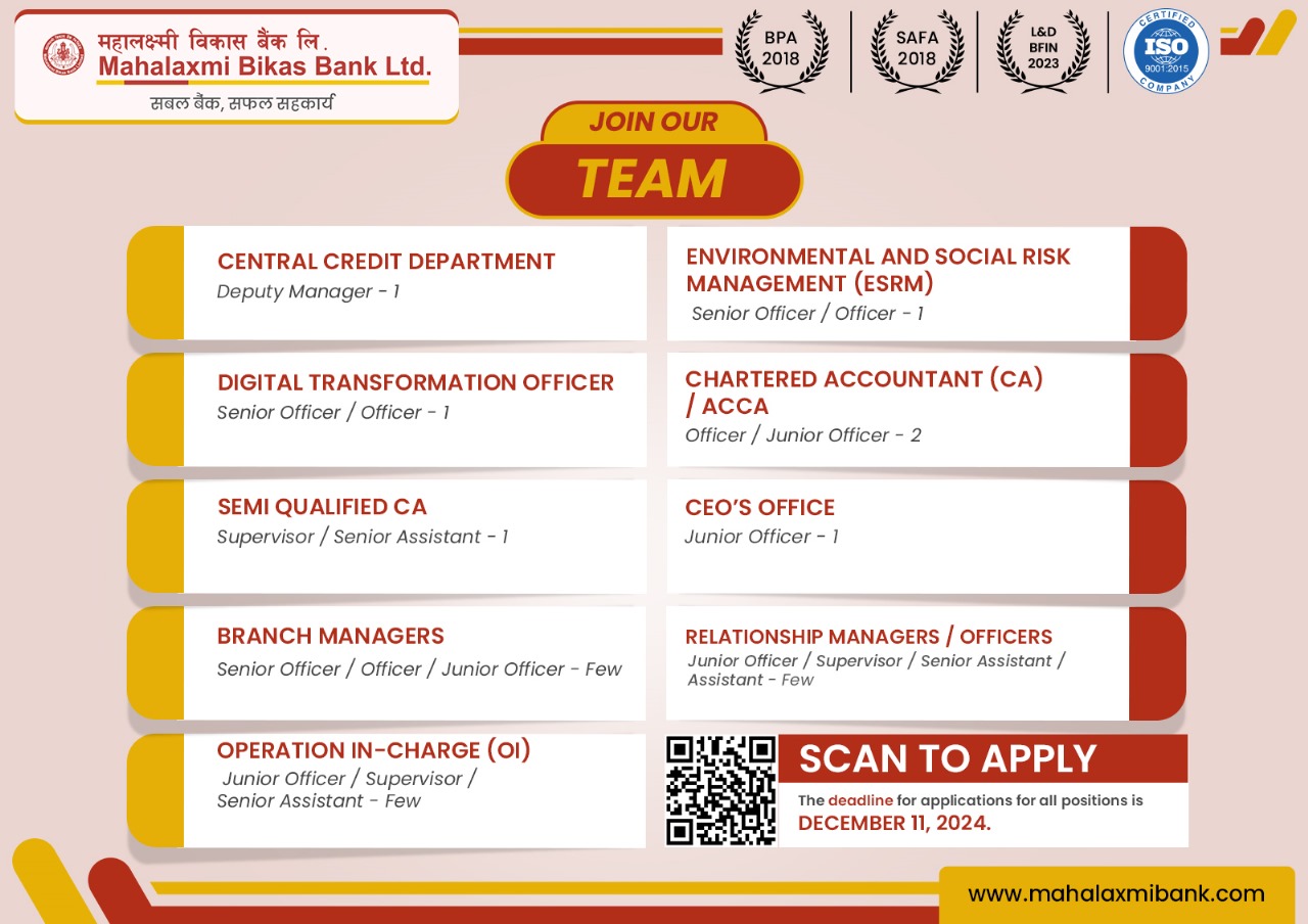 महालक्ष्मी विकास बैंकद्वारा ठूलो संख्यामा कर्मचारी माग (सूचनासहित)