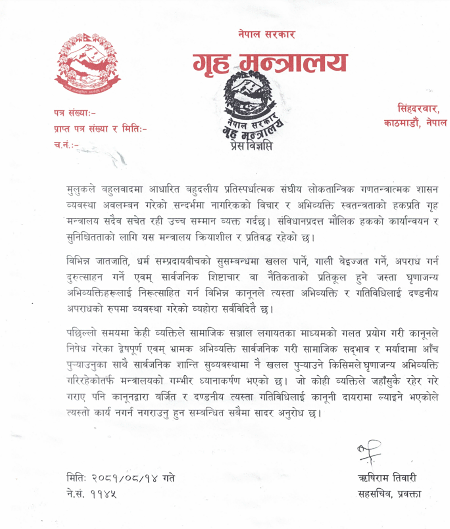 मन्त्रालयले शुक्रबार विज्ञप्ति जारी गर्दै सामाजिक सञ्जाल लगायतका माध्यमको गलत प्रयोग गरी कानुनले निषेध गरेका द्वेषपूर्ण एवम् भ्रामक अभिव्यक्ति सार्वजनिक गरी सामाजिक सद्भाव र मर्यादामा आँच पुऱ्याउनुका साथै सार्वजनिक शान्ति सुव्यवस्थामा नै खलल पुऱ्याउने किसिमले घृणाजन्य अभिव्यक्ति फैलाउन काम भइरहेको प्रति गम्भीर ध्यानाकर्षण भएको जनाएको हो ।
