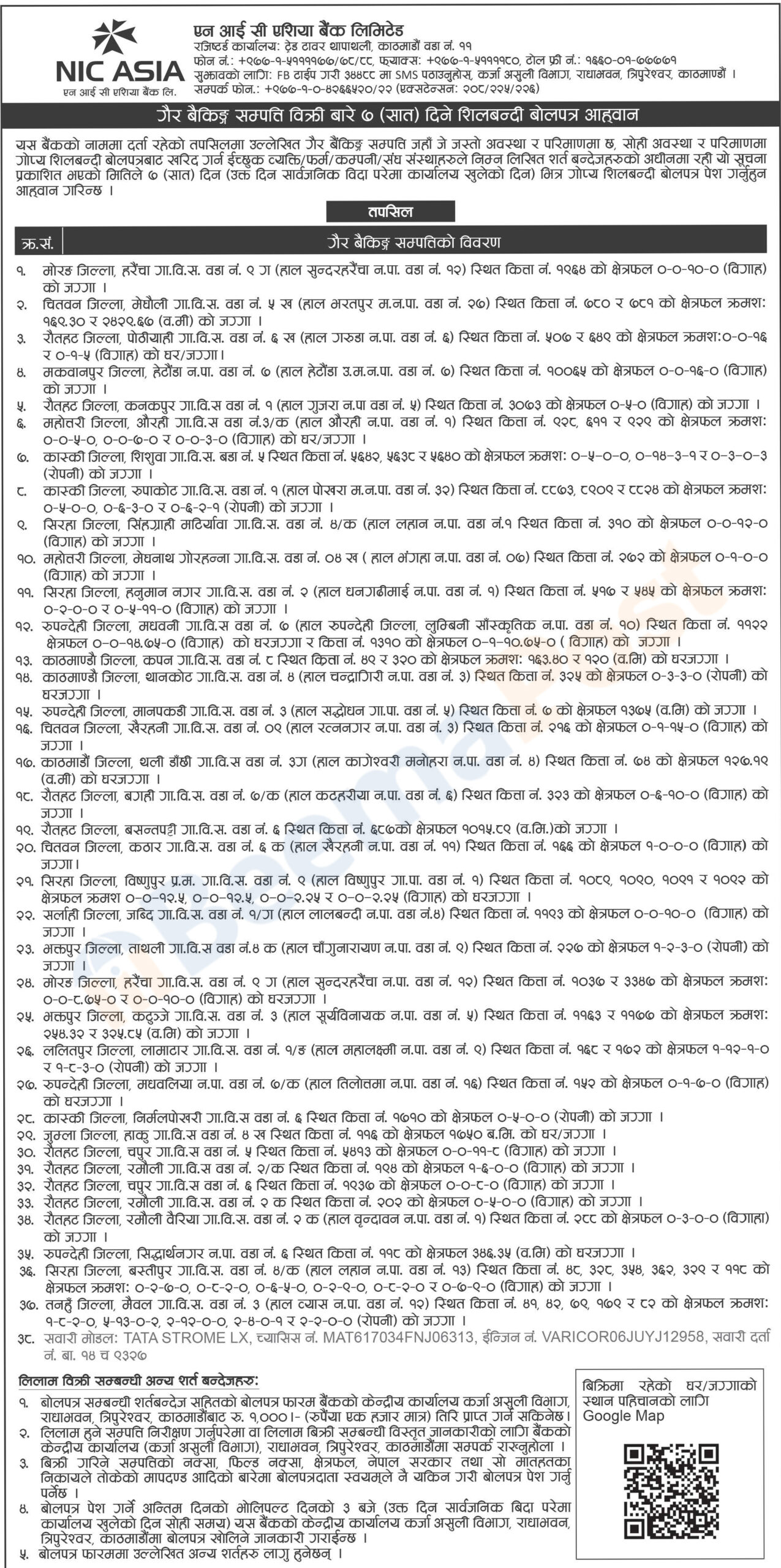 काठमाडौं । एनआइसी एशिया बैंक लिमिटेडले आफ्नो नाममा रहेको गैर बैंकिङ्ग सम्पति बिक्री गर्ने भएको छ । बैंकले एक सूचना प्रकाशित गर्दै आफ्नो नाममा दर्ता भएको स्थिर सम्पति लिलाम गर्न गोप्य शिलबन्दी बोलपत्र पेश गर्न आह्वान गरेको हो ।