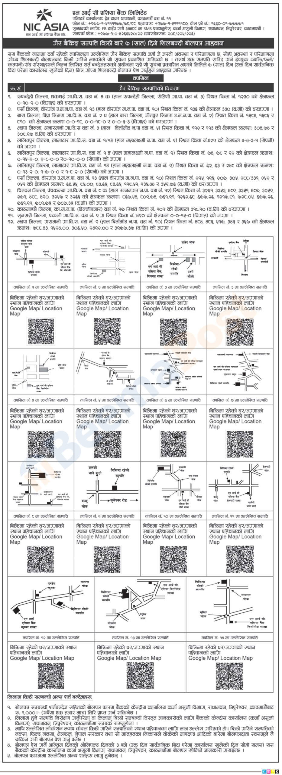 बैंकले पूर्वको मेचीदेखि पश्चिमसम्मका ५० स्थानका घर जग्गाा बिक्रीमा ल्याएको छ । बैंकका अनुसार सो गैर बैकिङ्ग सम्पति जहाँ जे जस्तो अवस्था र परिणाममा गोप्य शिलवन्दी बोलपत्रबाट बिक्री गरिने बैंकले जनाएको छ ।