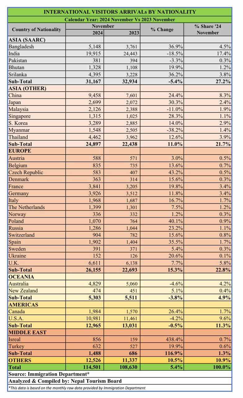 काठमाडौँ । नोभेम्बर २०२४ मा नेपालको पर्यटन क्षेत्रले ऐतिहासिक सफलता हासिल गरेको छ। यो महिनामा मात्र १ लाख १४ हजार ५०१ पर्यटक नेपाल आएका छन्, जुन २०२३ को तुलनामा ५.४ प्रतिशतले वृद्धि भएको हो। यस उपलब्धिले २०१९ को महामारीपूर्वको अवस्थासँग तुलना गर्दा ८७.८७ प्रतिशत पुनःस्थापना भएको संकेत गर्छ।