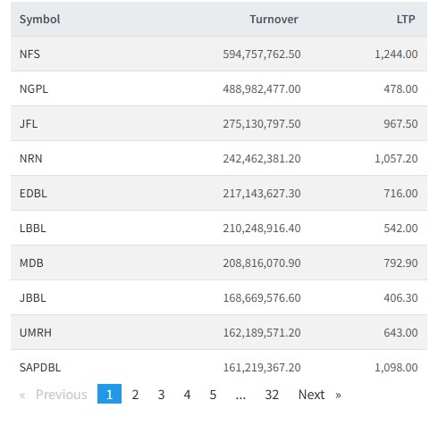 त्यस्तै, ङादी गुप्र, एनआरएन इन्फ्रास्टक्चर, जानकी फाइनान्स, एक्सेल डेभलपमेन्ट बैंैक, लुम्बिनी विकास बैंक, मितेरी डेभलपमेन्ट बैक, ज्योति विकास बैंक, युनाईटेड इदीमार्दी, सप्तकोशी विकास बैंकको सर्वाधिक कारोबार भएको छ।