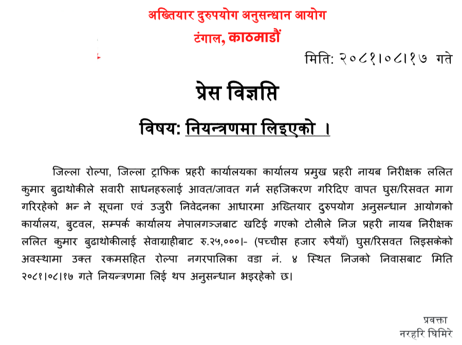 काठमाडौं । रोल्पा प्रहरी कार्यालयका कार्यालय प्रमुख प्रहरी नायव निरीक्षक ललीत कुमार बुढाथोकी पक्राउ परेका छन् । अख्तियार दुरुपयोग अनुसन्धान आयोगले बुढाथोकीलाई २५ हजार घुससहित पक्राउ गरेको हो ।