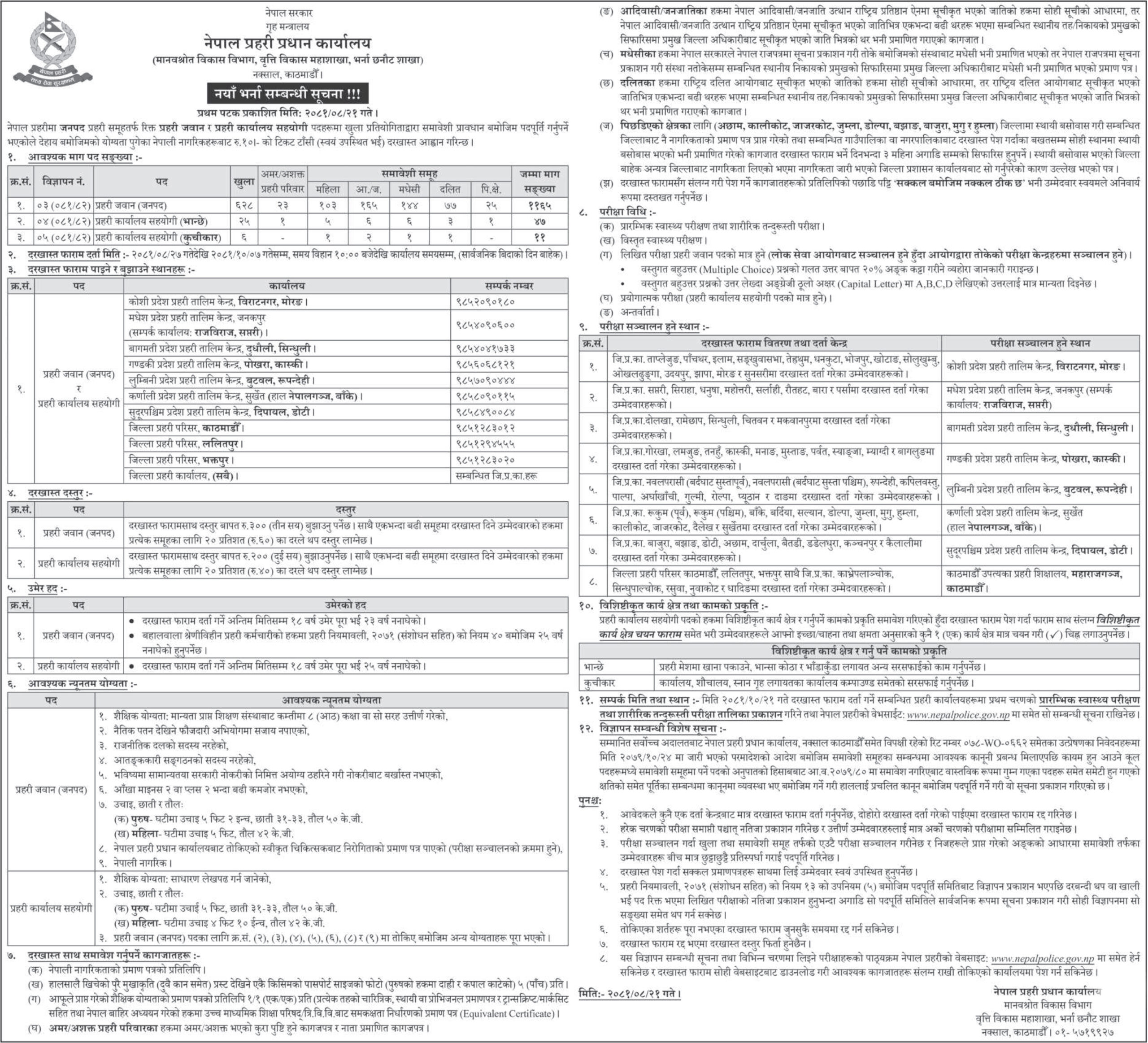 प्रहरी जवान (जनपद) तर्फ ११६५ जना, प्रहरी कार्यालय सहयोगीमा ४७ जना भान्से र ११ जना कुचीकार माग गरिएको छ। दरखास्त आवेदन मंसिर २७ गतेदेखि माघ ७ गतेसम्म दिन सकिनेछ। आवेदन दिनका लागि देशभरका विभिन्न ११ वटा कार्यालय तोकिएको छ।