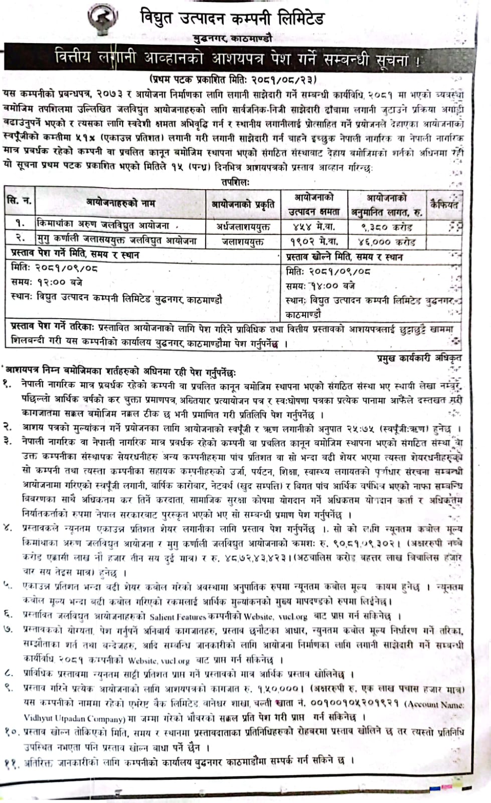 कम्पनीले आयोजनाहरूमा न्यूनतम ५१ प्रतिशत स्वपुँजी लगानी गर्न इच्छुक नेपाली नागरिक, नेपाली नागरिकबाट प्रवर्धित कम्पनी वा नेपालमा स्थापित संगठित संस्थाहरूबाट आशयपत्र माग गरेको छ । आशयपत्र पेश गर्न मङ्सिर २९ गतेदेखि १५ दिनको समय तोकिएको छ ।