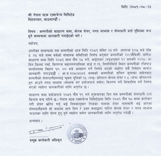 उक्त लाभांश प्रस्ताव पारितका लागि कम्पनीले पुष २८ गते बिहान १० बजे पर्सा जिल्लाको विरगन्ज महानगरपालिका वडा न २१ लिपनिविर्ता स्थित कम्पनीको रजिष्र्टड कार्यालयमा बस्ने गरी सभा आव्हान गरेको छ । जसका लागि पुष १९ गते बुक क्लोज गर्ने कम्पनीले जनाएको छ।