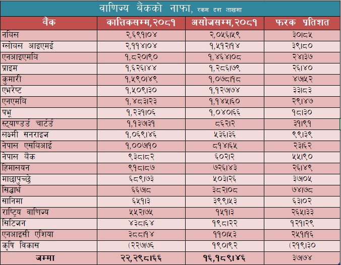कात्तिक महिनामा बैंकहरुले आर्जन गरेको नाफा असोजको तुलनामा ३७.७४ प्रतिशतले बढी हो । गत असोज मसान्तसम्ममा बैंकहरुले १६ अर्ब १८ करोड ९४ लाख रुपैयाँ नाफा कमाएका थिए । कात्तिक महिनामा मात्रै बैंकहरुले ६ अर्ब १० करोड ९२ लाख रुपैयाँ नाफा कमाएका छन् ।
