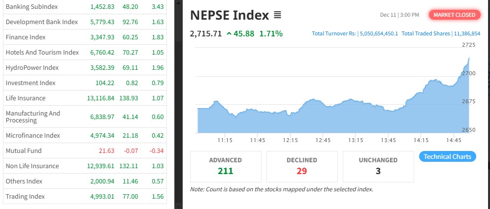 नेपाल स्टक एक्सचेञ्ज (नेप्से) ४५.८८ अकंले घटेर २७१५.७१ बिन्दुमा कायम भएको छ । आज ३०८ कम्पनीको १ करोड १३ लाख ८६ हजार कित्ता शेयर किनबेच हुँदा ५ अर्ब ५ करोड ६ लाख ५४ हजार रुपैयाँको शेयर कारोबार भएको छ ।