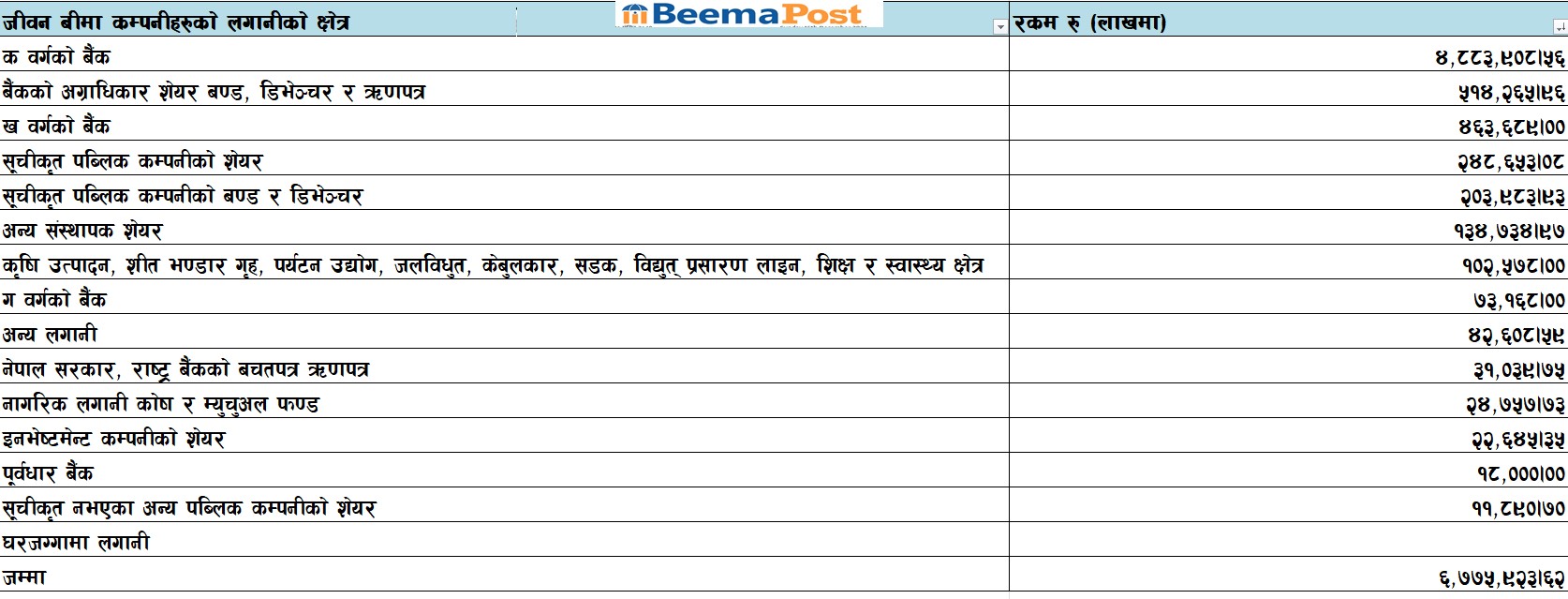 जीवन बीमा कम्पनीको कुन क्षेत्रमा कति लगानी ?