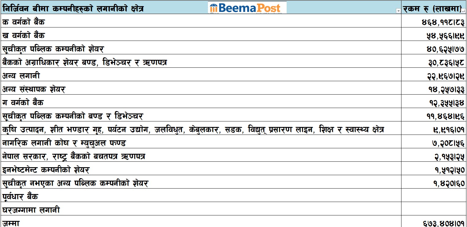 तथ्यांक अनुसार निर्जिवन बीमा कमपनीहरुको ,क, ख वर्गको बैंक र ,सूचीकृत पब्लिक कम्पनीको शेयरमा सबैभन्दा बढी लगानी रहेको छ।