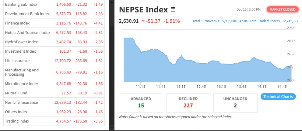 नेपाल स्टक एक्सचेञ्ज (नेप्से) ५१.३७ अकंले घटेर २६३०.९१ बिन्दुमा कायम भएको छ । आज ३०४ कम्पनीको १ करोड २७ लाख ४५ हजार कित्ता शेयर किनबेच हुँदा ५ अर्ब ९३ करोडको शेयर कारोबार भएको छ ।