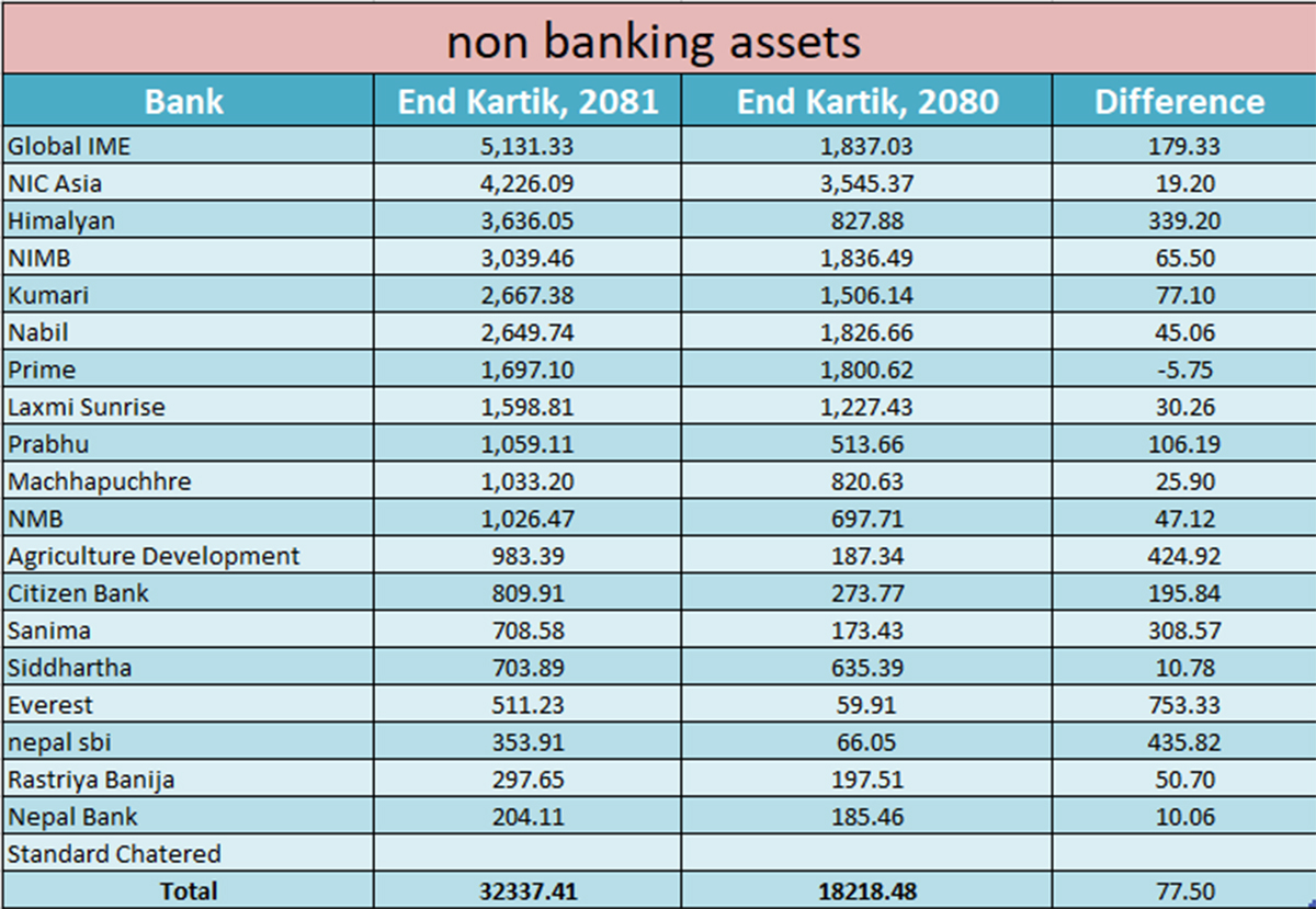 एभरेस्ट बैंकको गैरबैंकिङ्ग सम्पत्ति ५१ करोड १२ लाख रुपैयाँ छ भने नेपाल एसबीआई बैंकको ३५ करोड २९ लाख रुपैयाँ रहेको छ । राष्ट्रिय वाणिज्य बैंकसँग २९ करोड ७६ लाख र नेपाल बैंकसँग २० करोड ४१ लाख रुपैयाँको सम्पत्ति छ ।