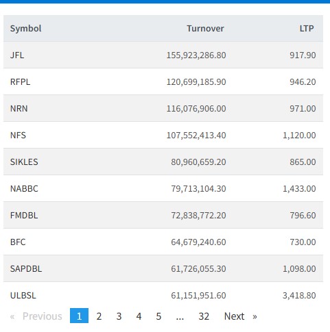 त्यस्तै, एनआरएन इन्फ्रास्टक्चर, रिभर फल्स, नेपाल फाइनान्स, सिक्लेस हाईड्रोपावर, फष्ट माईक्रोफाइनान्स, नारायणी डेभलपमेन्ट बैंक, बेष्ट फाइनान्स, उपकार लघुवित्त, र सप्तकोशी विकास बैंकको सर्वाधिक कारोबार भएको छ।