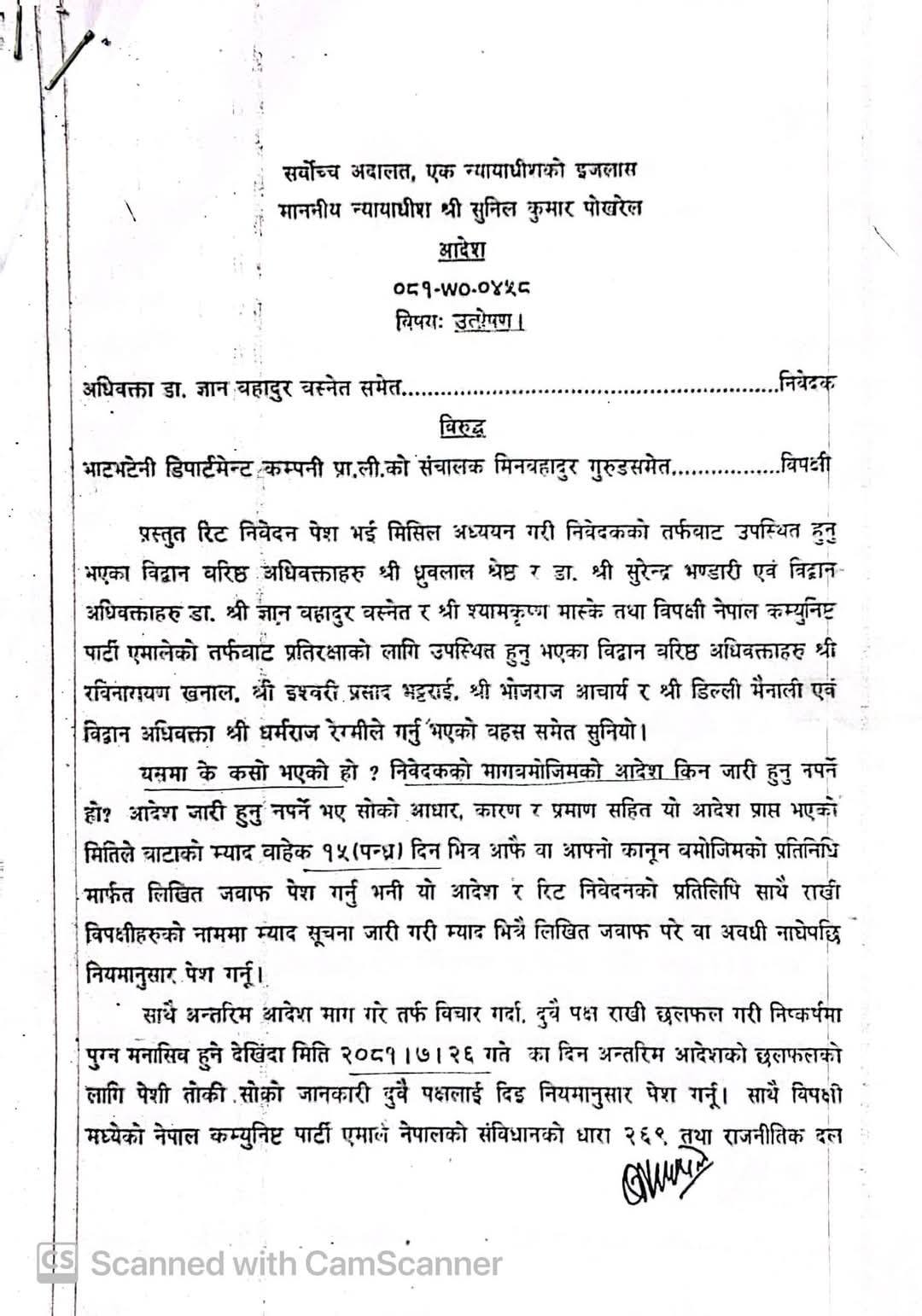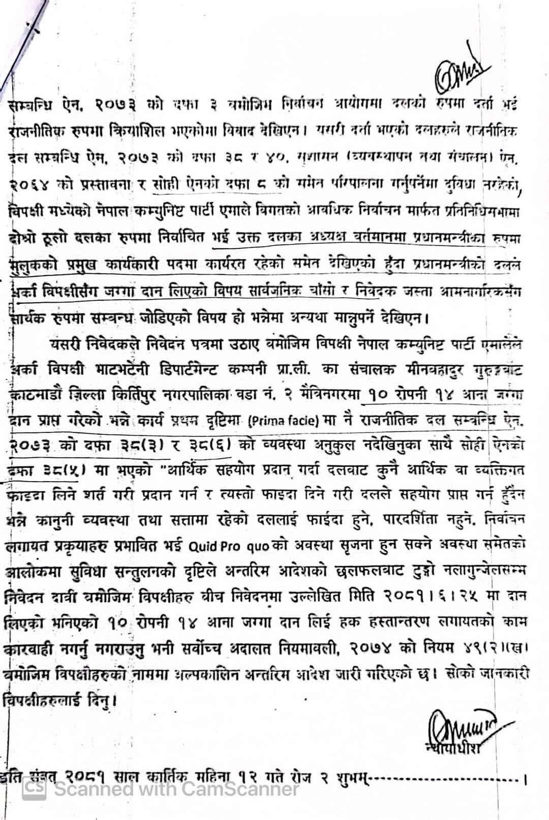 काठमाडौँ । सर्वोच्च अदालतले एमाले र भाटभटेनी डिपार्टमेन्ट स्टोरका संचालक मिनबहादुर गुरुङबिचको जग्गा दान प्रकरणमा अल्पकालीन अन्तरिम आदेश जारी गरेको छ। आदेशअनुसार, दान लिएको भनिएको १० रोपनी १४ आना जग्गाको हक हस्तान्तरण लगायतका कुनै पनि काम नगर्न–नगराउन आदेश जारी गरिएको छ।