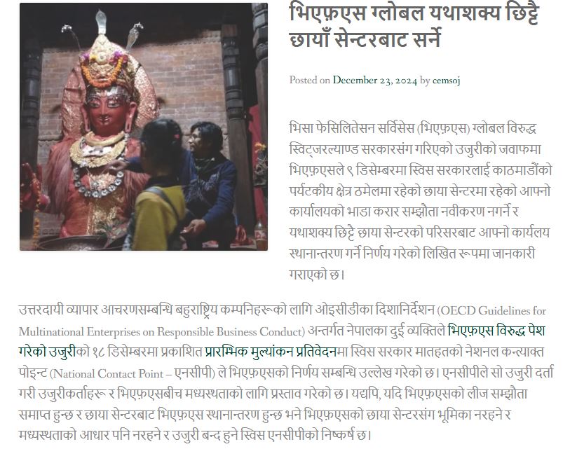 पराम्परागत रुपमा प्रधान नेवाः गुठीको स्वामित्वमा रहेको धार्मिक, सांस्कृतिक एवं पुरातात्विक महत्वको कमलपोखरी र परपरको जग्गा अतिक्रमण गरेर निर्माण गरिएको छायासेन्टरसँग भीएफएस समेतको संलग्नता रहेको भन्दै गएको अगस्तमा स्वीस नेशनल कन्ट्याक्ट पोइन्ट (एनपीसी)मा उजुरी परेको थियो । एनपीसीले छाया सेन्टरसँगको सम्झौता अर्थात् करार नवीकरण नगर्नु नै उपयुक्त विकल्प हुने भन्दै त्यहाँबाट स्थानान्तरण हुन र उजुरीको लफडाबाट मुक्त हुन सुझाव दिएको छ ।
