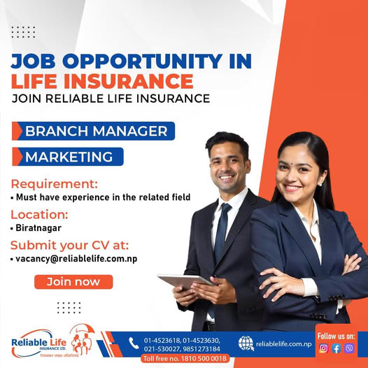 काठमाडौँ । रिलायबल नेपाल लाइफ इन्स्योरेन्सले रोजगारीको अवसर खुलाएको छ । कम्पनीले एक सूचना जारी गर्दै बिराटनगर शाखा कार्यालयको लागि ब्रान्च म्यानेजर र मार्केटिङ पदमा कर्मचारी माग गरेको हो ।