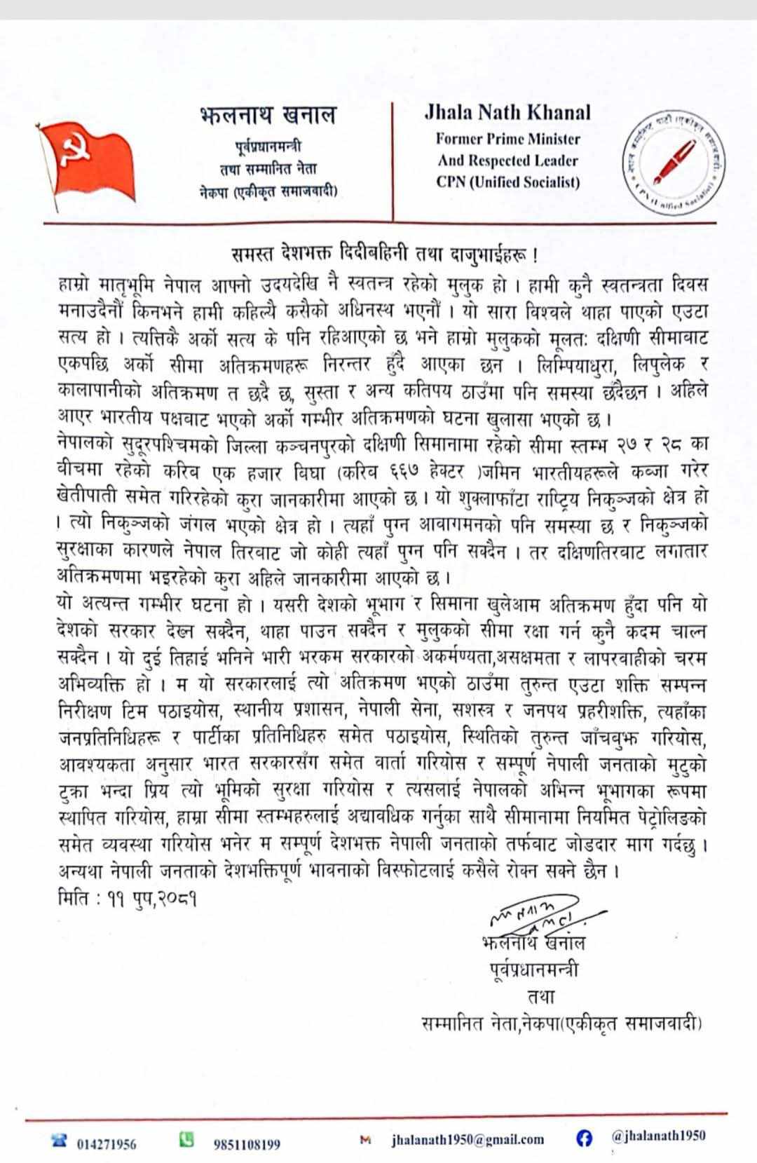 कञ्चनपुरको दक्षिणी सिमानास्थित सीमा स्तम्भ २७ र २८ का बीचमा रहेको करिब एक हजार विघा जमिन भारतियले कब्जा गरेर खेतीपातीसमेत गरिरहेको कुरा जानकारीमा आएको उल्लेख गर्दै पूर्वप्रधानमन्त्री खनालले यस विषयमा तुरुन्त कदम चाल्न सरकारसँग माग गरेका हुन् ।