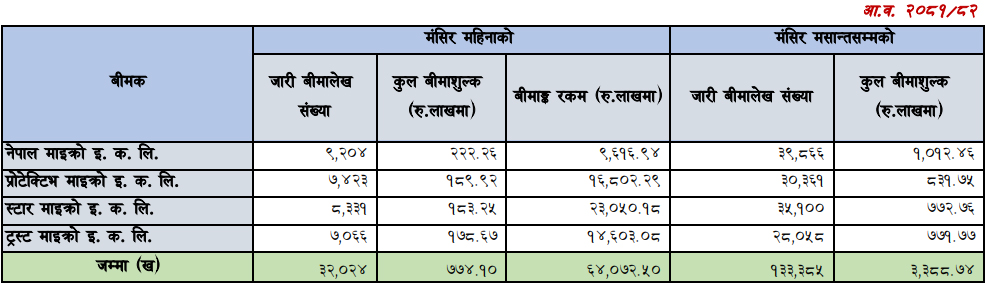 यी कम्पनीहरूले १ लाख ३३ हजार ३८५ वटा बीमालेख जारी गरेर यो राशीको बीमाशुल्क आर्जन गरेका हुन्। नेपाल माइक्रोले सर्वाधिक ३९ हजार ८६६ बीमालेख, स्टार माइक्रोले ३५ हजार १०० बीमालेख, प्रोटेक्टिभ माइक्रोले ३० हजार ३६१ बीमालेख र ट्रष्ट माइक्रोले २८ हजार ५८ वटा बीमालेख जारी गरेका छन्।