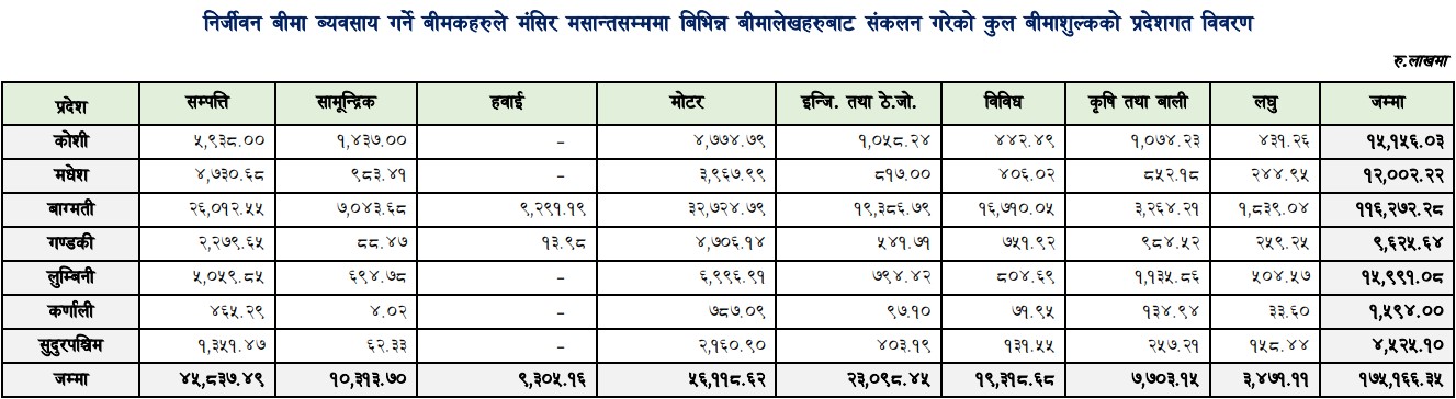 निर्जीवन बीमकको व्यवसाय बाग्मती प्रदेशमा सर्वाधिक, अन्य प्रदेशमा कति?