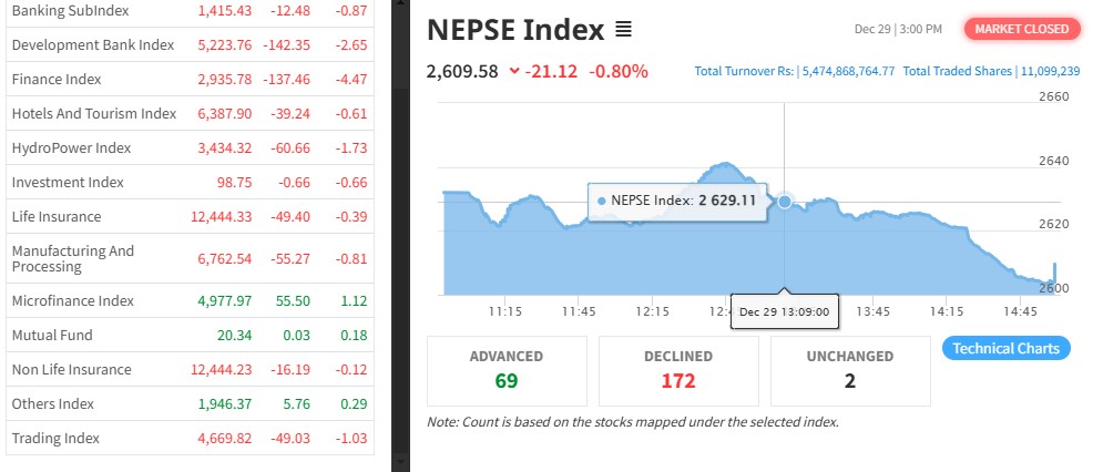 नेपाल स्टक एक्सचेञ्ज (नेप्से) २१.१२ अकंले घटेर २६०९.५८ बिन्दुमा कायम भएको छ । आज ३१६ कम्पनीको १ करोड १० लाख ९९ हजार कित्ता शेयर किनबेच हुँदा ५ अर्ब ४७ करोड रुपैयाँको शेयर कारोबार भएको हो ।