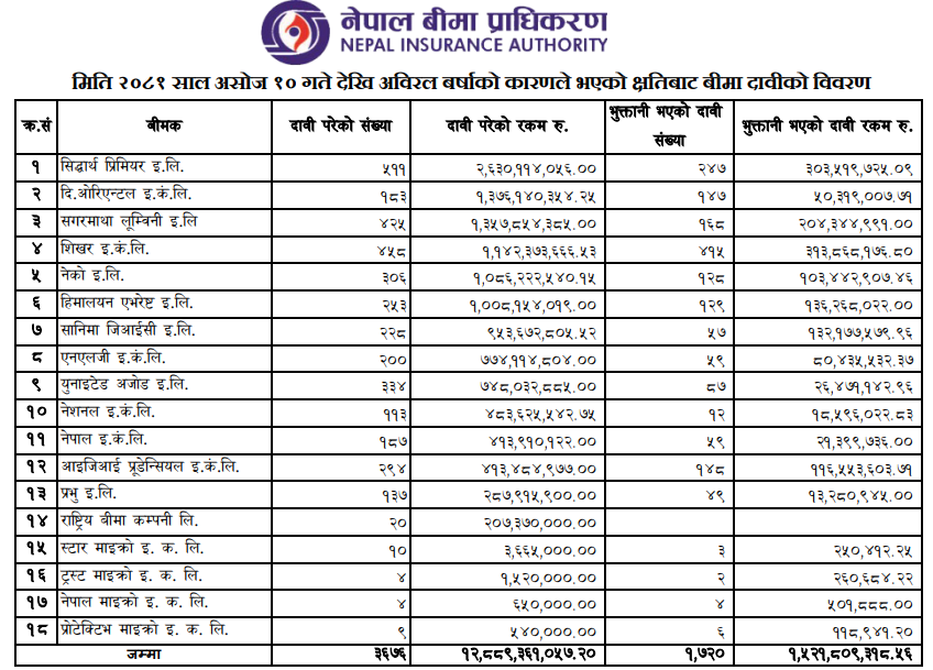 बाढीपहिरोको क्षतिले बीमा कम्पनीमा पर्यो १३ अर्बको दावी, डेढ अर्ब भुक्तानीमा कुनले कति दिए ?(विवरणसहित)