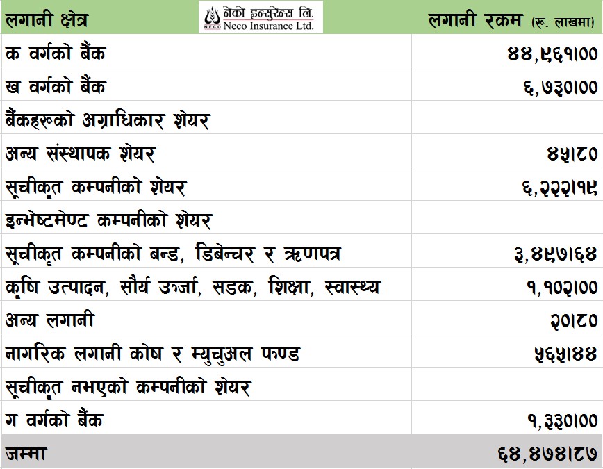 नेको इन्स्योरेन्सको लगानी झण्डै साढे ६ अर्ब, कुन क्षेत्रमा कति?