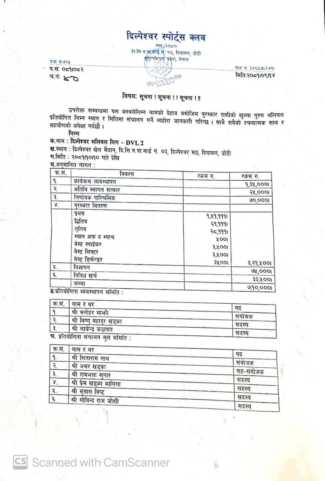 प्रतियोगिता ब्यवस्थापन समिति संयोजकको जिम्मेवारी मनोहर माझीले सम्हाल्नेछन् । विष्णु बहादुर खड्का र लाकेन्द्र कठायत सदस्यका रूपमा रहनेछन् । यता, प्रतियोगिता संचालन मुल समितिमा सिताराम नाथ संयोजक, अमर खड्का सह–संयोजक र रामभक्त सुनार, प्रेम खड्का मालिंगा, सुवास विष्ट र गोविन्द राज जोशी सदस्यका रूपमा रहनेछन् ।