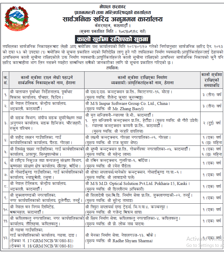 सूचनामा सार्वजनिक खरिद ऐन २०६३ को दफा ६३ (१) अनुसार १२ कम्पनीहरूलाई कालोसूचीमा राखिएको उल्लेख गरिएको छ । सार्वजनिक खरिद अनुगमन कार्यालयले कालोसूचीमा परेका निर्माण व्यवसायी र आपूर्तिकर्ताले १ देखि ३ वर्षसम्म कुनै पनि खरिद प्रक्रियामा सहभागी हुन नपाउने सूचनामा उल्लेख गरेको छ ।