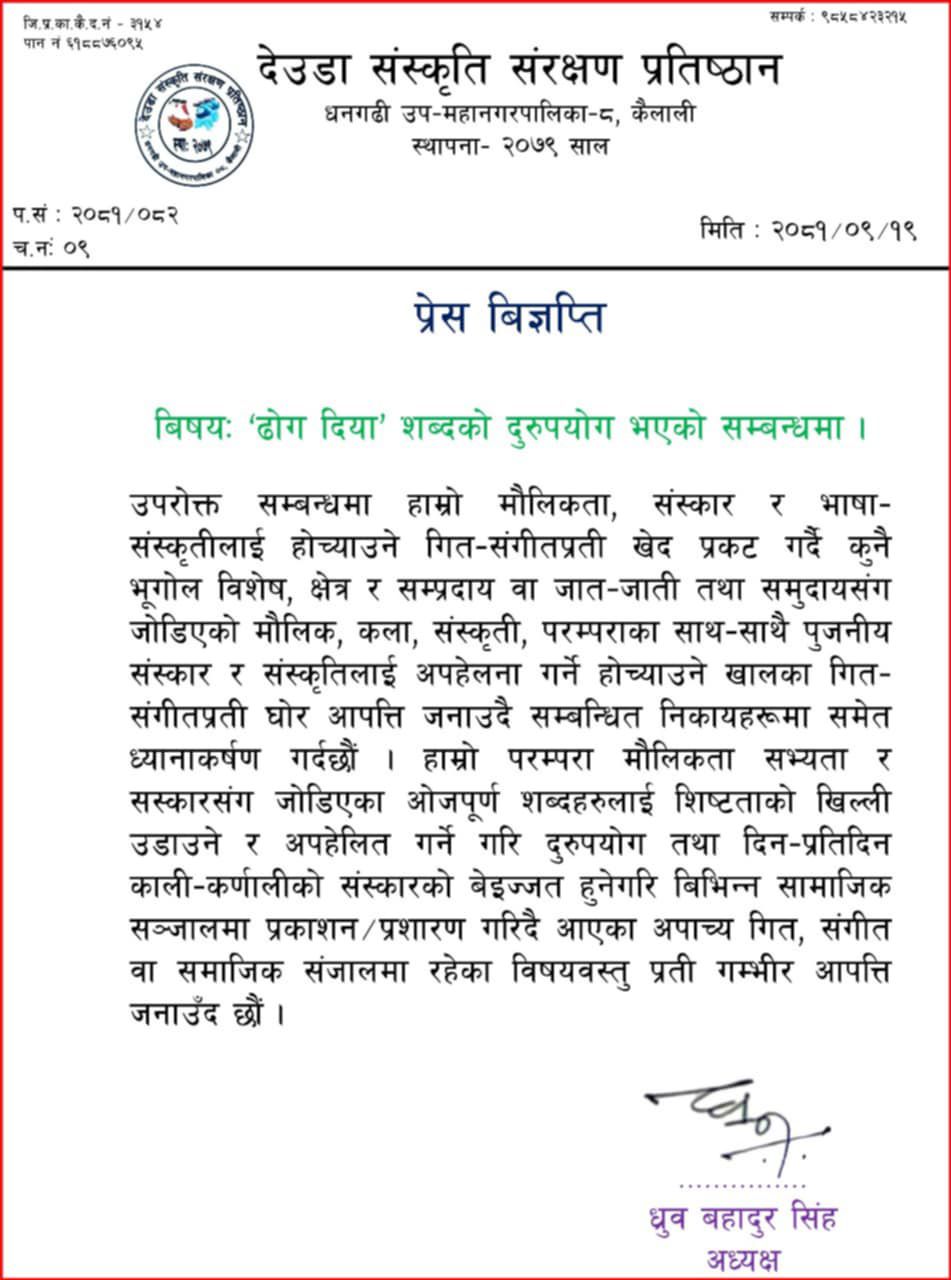 काठमाडौँ । देउडा संस्कृति संरक्षण प्रतिष्ठानले ढोग दिया शब्दको दुरुपयोग र त्यससँग जोडिएका गित संगीतप्रति घोर आपत्ति जनाएको छ। प्रतिष्ठानका अध्यक्ष ध्रुव बहादुर सिंहले आज एक प्रेस बिज्ञप्ति जारी गर्दै यस्तो गित संगीतको प्रसारलाई समाजको संस्कार र परम्परासँग मेल खाएको छैन भनेर स्पष्ट पारेका छन्।