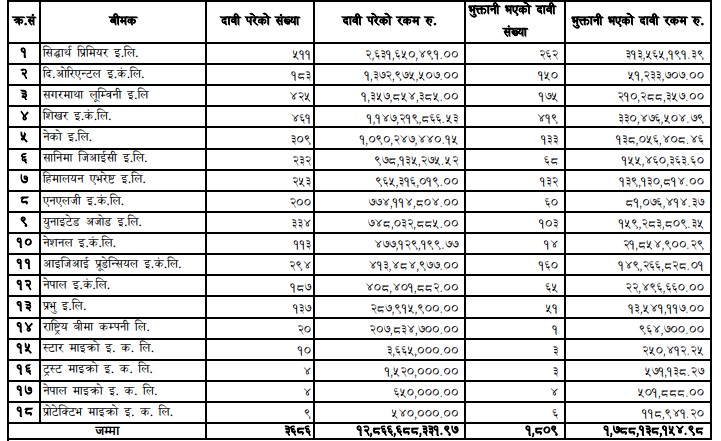 यस्तै, इञ्जियिरिङ तथा ठेकेदार जोखिममा तीन सय २४ वटा दाबी परेको छ । त्यसमा दुई अर्ब ८४ करोड १९ लाख २६ हजार पाँच सय ९२ रुपैयाँ बराबरको दाबी परेको प्राधिकरणले जनाएको छ । मोटर बीमा निजीतर्फ नौ सय ५४ वटा आवेदन परेको छ । त्यसमा ४१ करोड ५३ लाख ४४ हजार रुपैयाँ बराबरको दाबी रकम माग गरिएको छ ।मोटर बीमा सार्वजनिकतर्फ तीन सय ९३ वटाको आवेदन परेको छ । त्यसमा २८ करोड ९९ लाख १६ हजार रुपैयाँ बराबरको दाबी रकम माग भएको छ । सामुन्द्रिक बीमा २३ वटा आवेदन परेको छ । त्यसमा चार करोड चार लाख ९७ हजार रुपैयाँ बराबरको रकम माग भएको छ ।