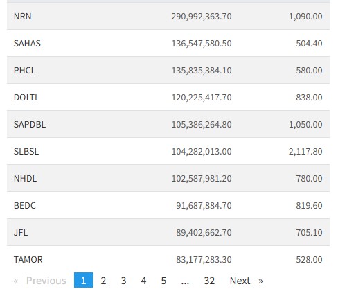 त्यस्तै, साहस उर्जा, पिपुल्स हाइड्रोपावर, दोल्ती पावर, नेपाल हाईड्रो, सामुदायिक लघुवित्त, जानकी फाइनान्स, तमोर मिडिल र युनाईटेड इर्दी मर्दीको सर्वाधिक कारोबार भएको छ।