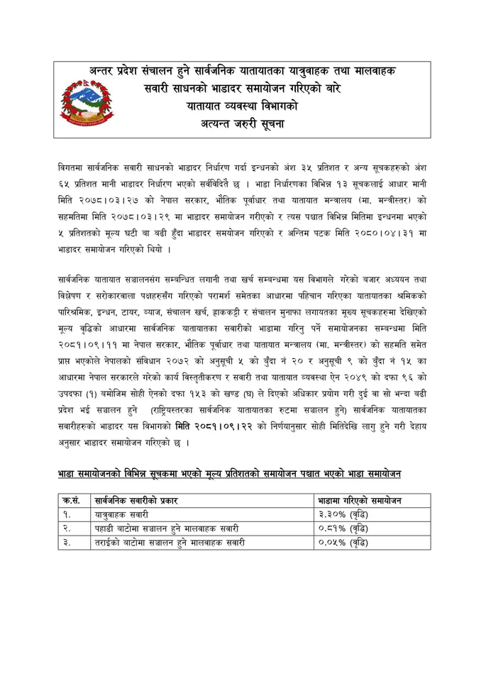 यसपटक दुई वा सोभन्दा बढी प्रदेशलाई जोड्ने राष्ट्रिय स्तरका सार्वजनिक सवारी साधनका भाडामा समायोजन गरिएको छ। विभागका अनुसार यसअघि ३१ साउन २०८० मा भाडा समायोजन भएको थियो।