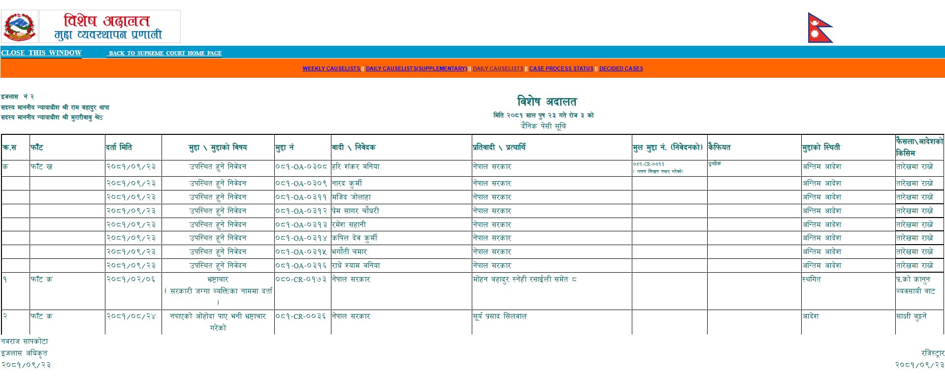 भ्रष्टाचार सम्बन्धी मुद्दामा बिशेष अदालतमा महिनौं दिनसम्म पेशीमा चढ्न कठिन हुँदै आएकोमा सुर्य सिलवालको मुद्दा भने रातारात पेशीमा चढेको छ । आजको इजलास अधिकृत नबराज सापकोटा थिए ।
