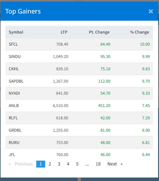 त्यस्तै, सप्तकोशी डेभलपमेन्ट बैंक, रिलायन्स फाइनान्स, न्यादी हाइड्रोपावर, आत्मनिर्भर लघुवित्त, ग्रीन डेभलपमेन्ट बैंक लगायतको शेयरमूल्य बृद्धि भएको छ ।