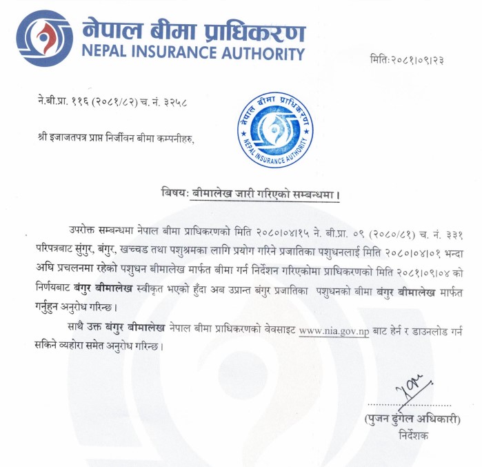 प्राधिकरणले सम्पूर्ण इजाजत प्राप्त निर्जीवन बीमा कम्पनीहरुले पुष २३ गते एक निर्देशन जारी गर्दै बंगुर बीमालेख अन्तर्गत संगुर, बंगुर र खच्चडहरुको बीमा गर्न निर्देशन दिएको हो ।