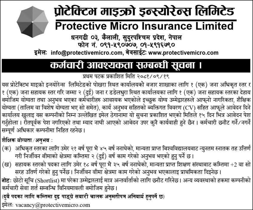 काठमाडौँ । प्रोटेक्टिभ माइक्रो इन्स्योरेन्स लिमिटेडले कर्मचारी माग गरेको छ । कम्पनीले एक सूचना प्रकाशित गर्दै कर्मचारी माग गरेको हो । कम्पनीले पोखरा शाखा कार्यालयमा दुई जना, डडेल्धुरा शाखा कार्यालयमा एक जना सहायक स्तरको कर्मचारी माग गरेको छ ।