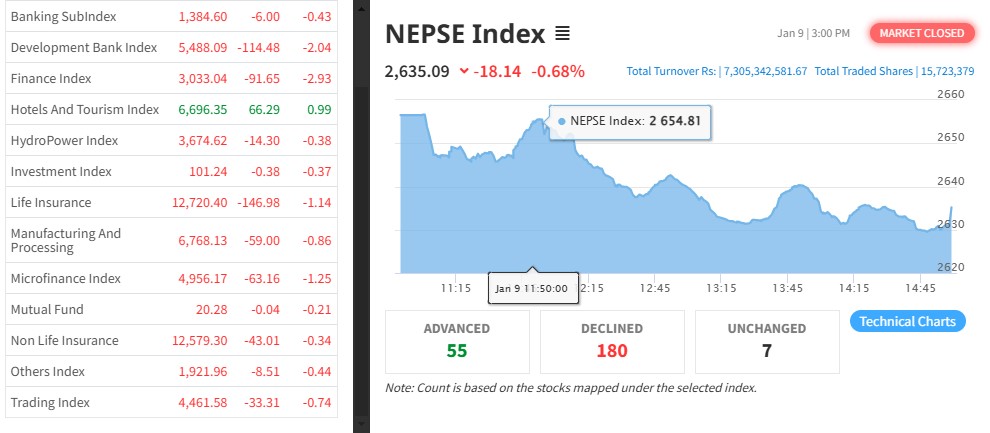 नेपाल स्टक एक्सचेञ्ज (नेप्से) १८.१४ अकंले घटेर २६३५.०९ बिन्दुमा कायम भएको छ । आज३०८ कम्पनीको १ करोड ५७ लाख २३ हजार कित्ता शेयर किनबेच हुँदा ७ अर्ब ३० करोडको शेयर कारोबार भएको छ ।