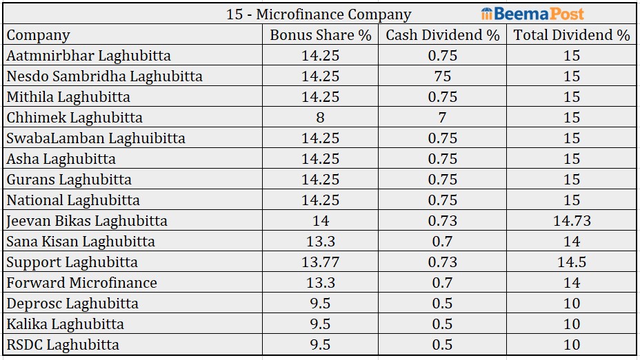 यस वर्ष कुल १५ वटा लघुवित्त कम्पनीहरुको १० प्रतिशतमाथि लाभांश रहेको छ । जसमा आत्मनिर्भर, नेष्डो समृद्ध, मिथिला, छिमेक, स्वावलम्बन, आशा, गुराँस र नेशनल लघुवित्तको १५ प्रतिशत लाभांश रहेको छ । त्यस्तै, जीवन विकास, साना किसान र सपोर्ट माइक्रोफाइनान्सको १४ प्रतिशतबढी लाभांश रहेको छ।
